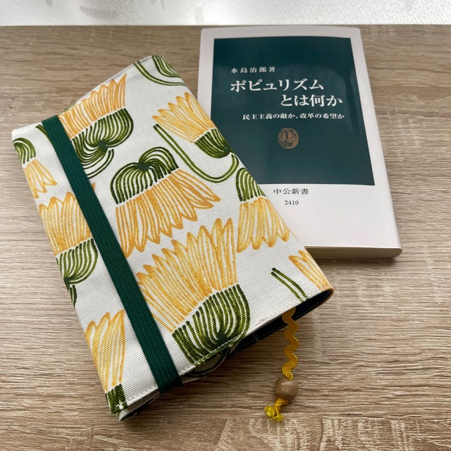 新書判サイズのブックジャケットです。 少年少女コミック単行本にも合うサイズです。 ゴムバンドで留められる様になっています。 ジャケットに合わせた栞付きです。 個性について ::::::::::::::::::: サインペンでラフに手描きした大きな黄色い花が素敵です 裏地は深いグリーンのチェックを合わせました :::::::::::::::::::::::::::::::::::::::::::::: ■本体サイズ(約) : 〈高さH 18.5cm × 幅W 32cm〉 ※広げた時の長さ 標準的な新書判のサイズは〈高さH 18.2cm × 幅W 10.3cm〉です。 〈高さH 18.2cm〉まで、〈厚さD 3cm〉まで 対応しています。 ■素材 : コットン、ポリエステル、ポリウレタン、木材 ※お洗濯は手洗いか、ネットに入れて洗濯機をお使い下さい。 ■送料について : ①クリックポスト(全国一律200円)※追跡サービス有 ポスト投函です。総重量<1kg>まで ②レターパックプラス(全国一律520円)※追跡サービス有 対面受け取りの宅配です。総重量<4kg>まで ご注文数に応じて総重量を超える場合は、 発送方法が変更になり追加料金が発生いたします。 (例/A5判サイズを4枚ご購入で総重量は300g程です) CAUTION :::::::::::::::::::::::::::::::::::::: ★一点物ですが、他サイトにて同時出品しております。 ご購入のタイミングによって(既に他サイトで購入されていた場合)は、 止むを得ずキャンセルさせていただく場合がございます。何卒ご了承ください。 ★写真中の本は含まれません。 ★画面上の写真と実物の色は極力合わせてありますが ご覧になる環境で多少違いが出てしまう場合がございます。ご了承下さい。 ★ハンドメイド作品のためそれぞれに個性があります。 ご理解の頂ける方のご購入をお願いいたします。 ★ご注文後のキャンセル、返品、交換は受け付けておりません。 商品に破損や不備があった場合、商品到着後3日以内にご連絡ください。 至急対応をさせていただきます。 ★京都府からクリックポストでの発送には、中1日~2日(本州) 北海道(中3~4日)九州(中3日~4日)沖縄(中6日)程度かかります。 ★配送中による事故や破損については責任を負いかねます。