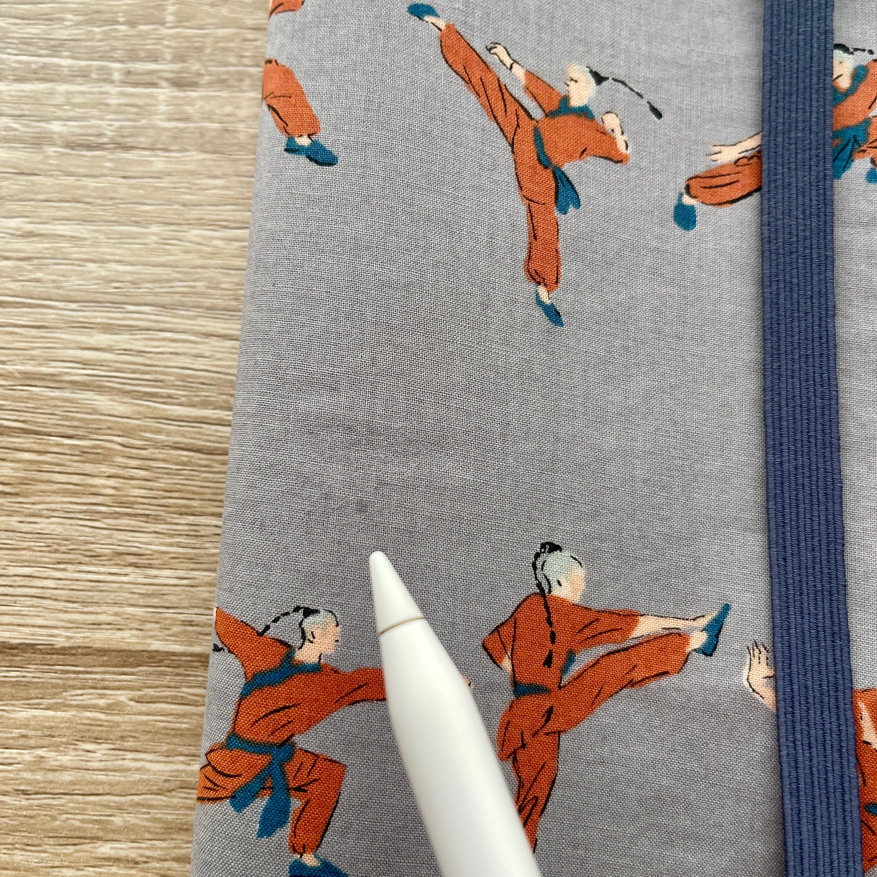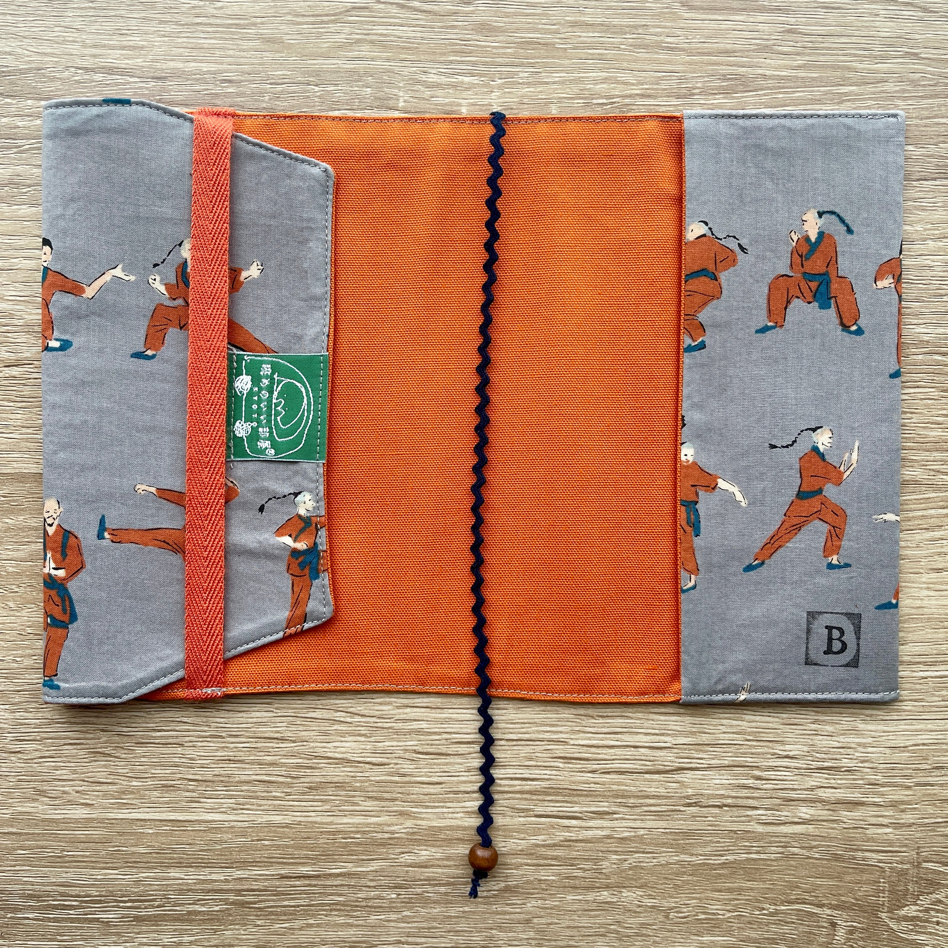 中面は鮮やかなオレンジのオックス生地にブルーグレーのゴムバンドを合わせました。