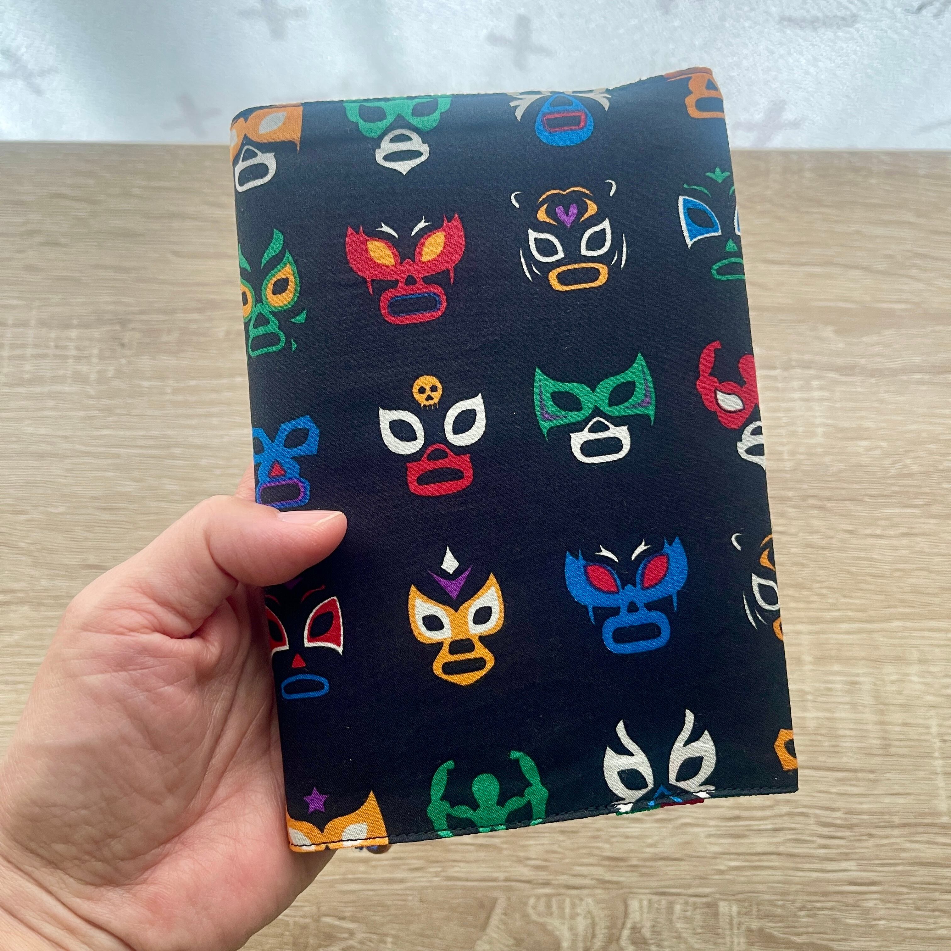 表地は黒地にカラフルなマスクマンが可愛いコットン生地です。