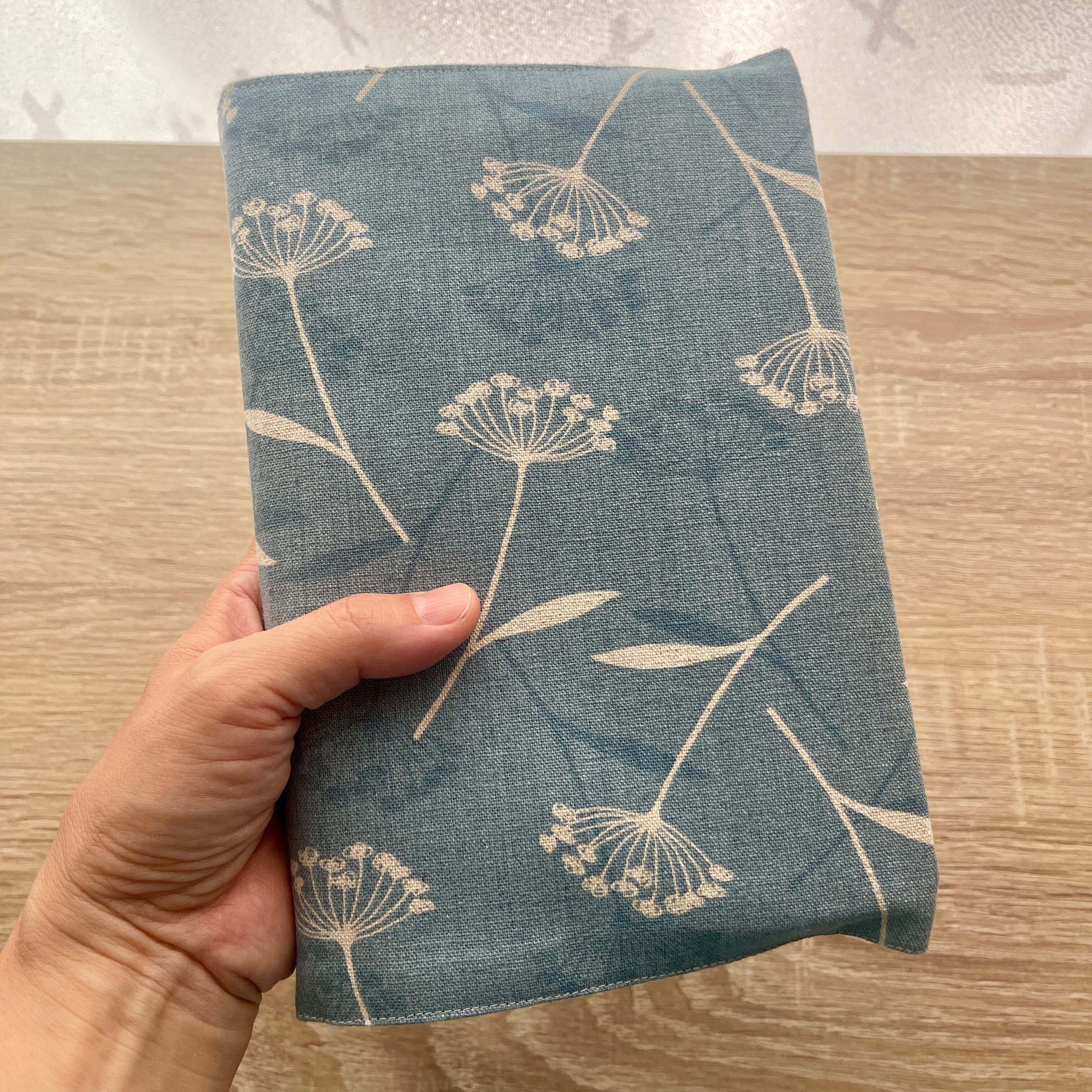 表地はライトブルーのしっかりしたコットンリネンで陰影のついた花柄、