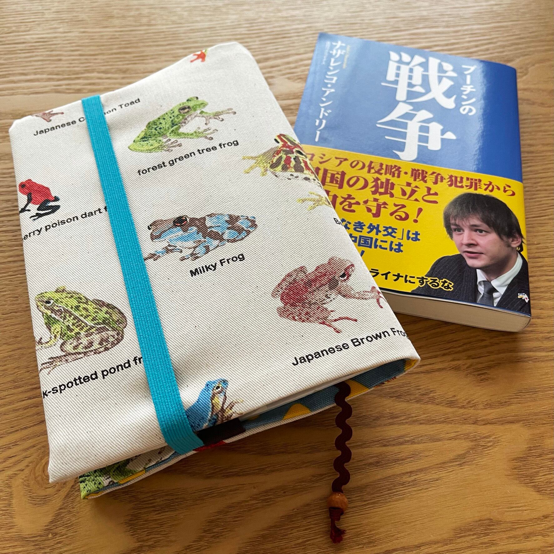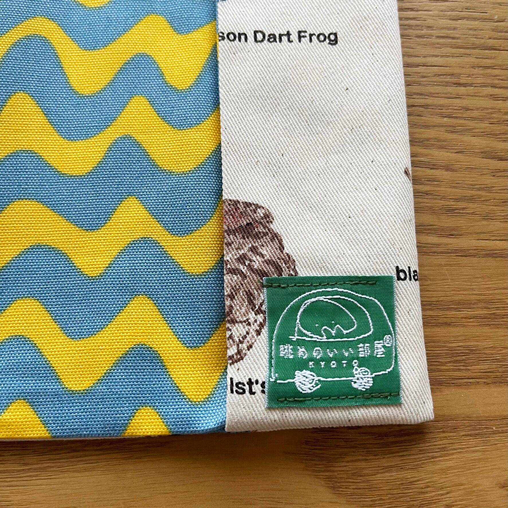 表地は生成デニム織りの生地に図鑑から飛び出したようなカエルが可愛い(!?)生地です。