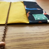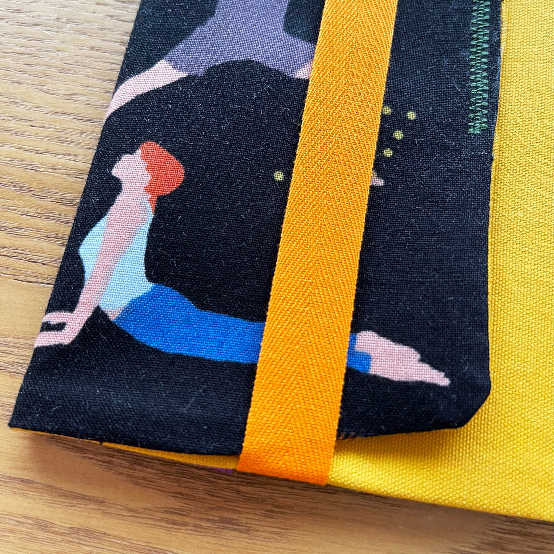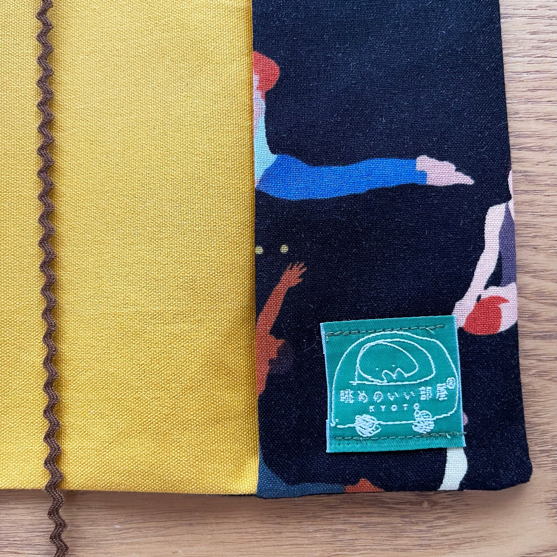 表地は黒地にヨガをする人のイラストが個性的な生地です。