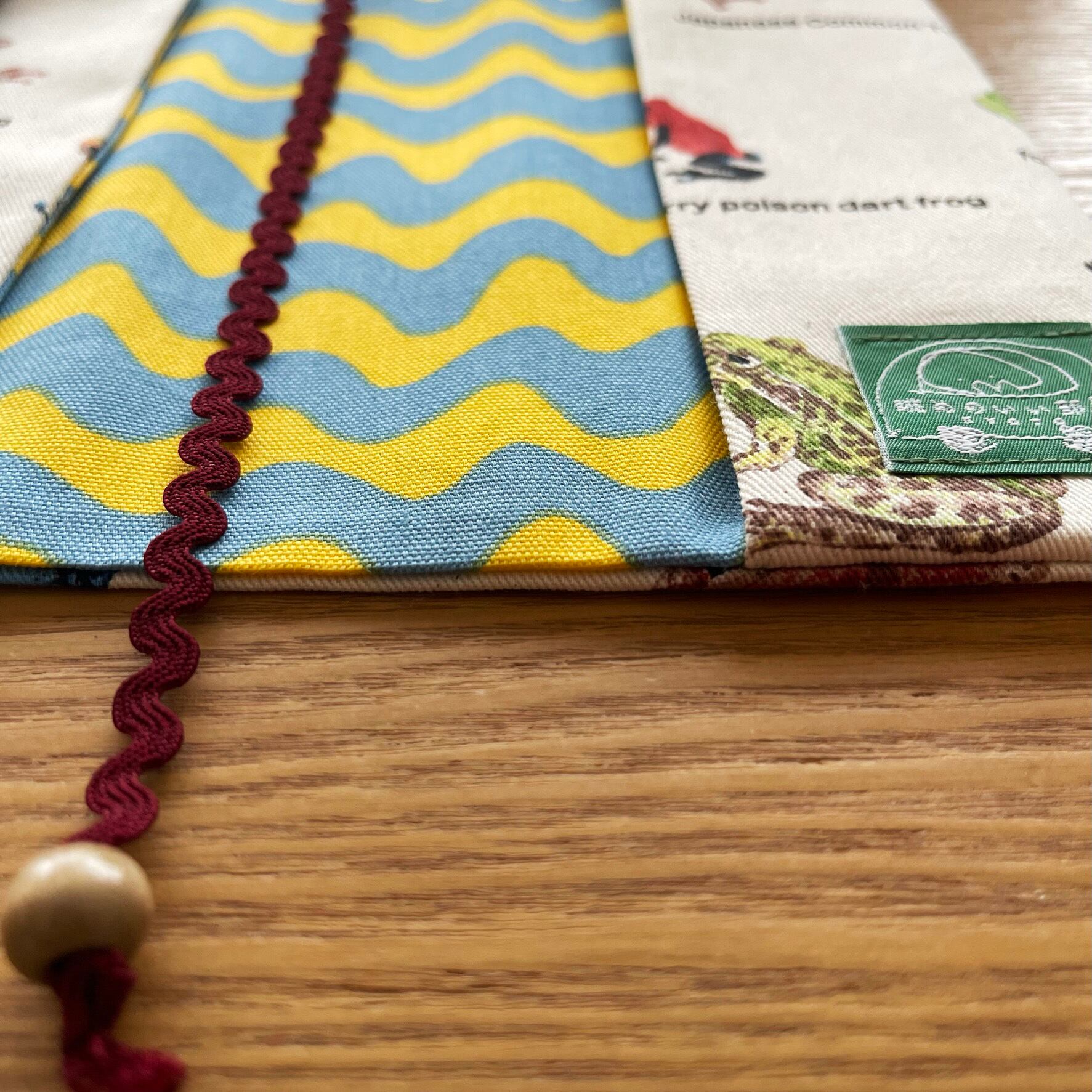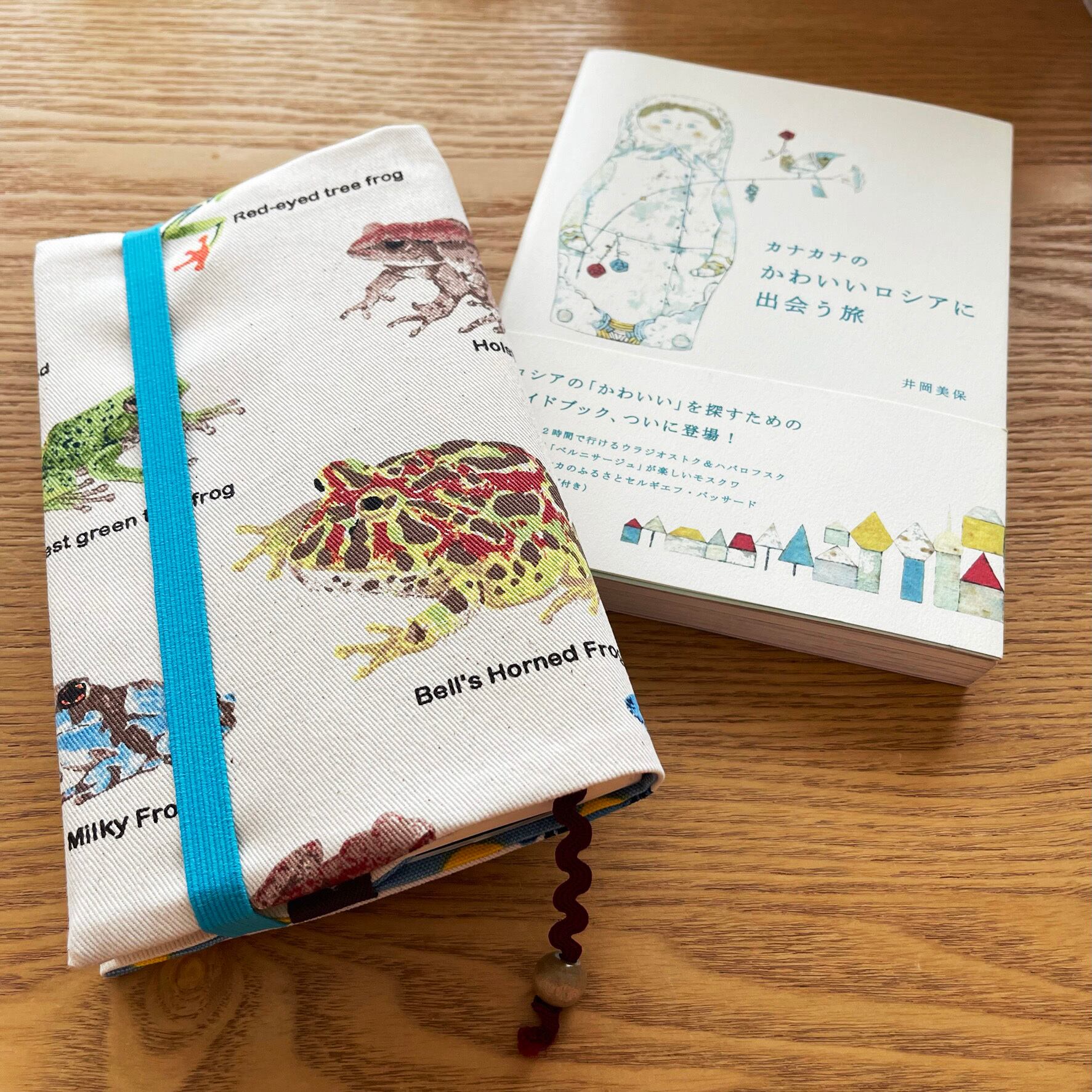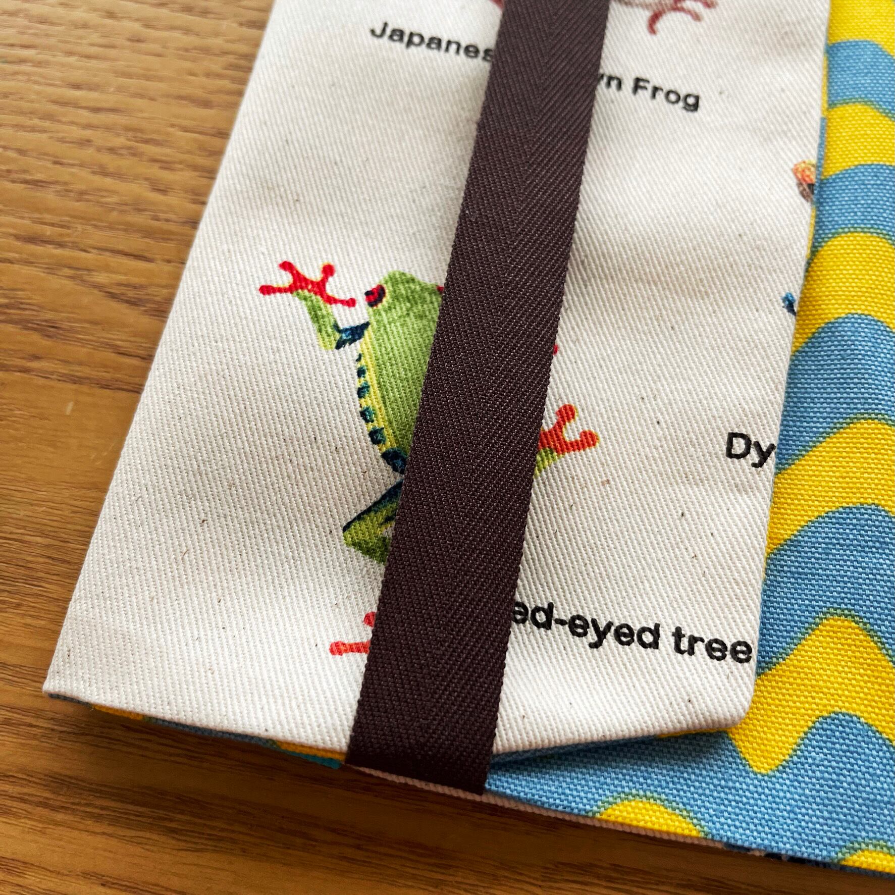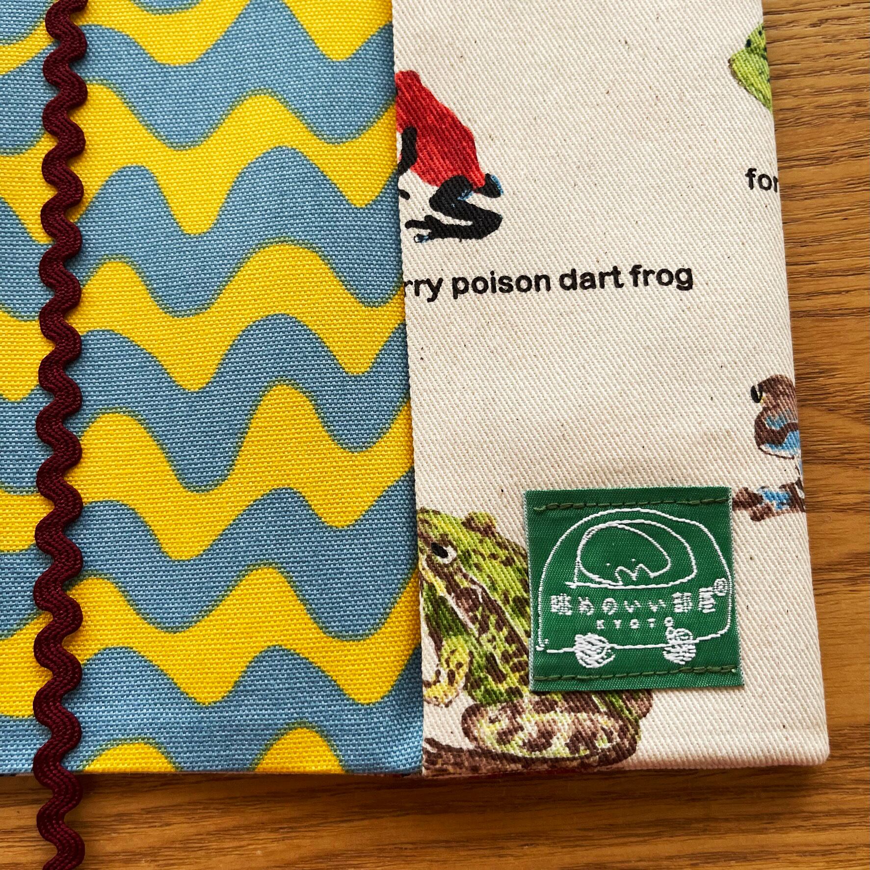 表地は生成デニム織りの生地に図鑑から飛び出したようなカエルが可愛い(!?)生地です。
