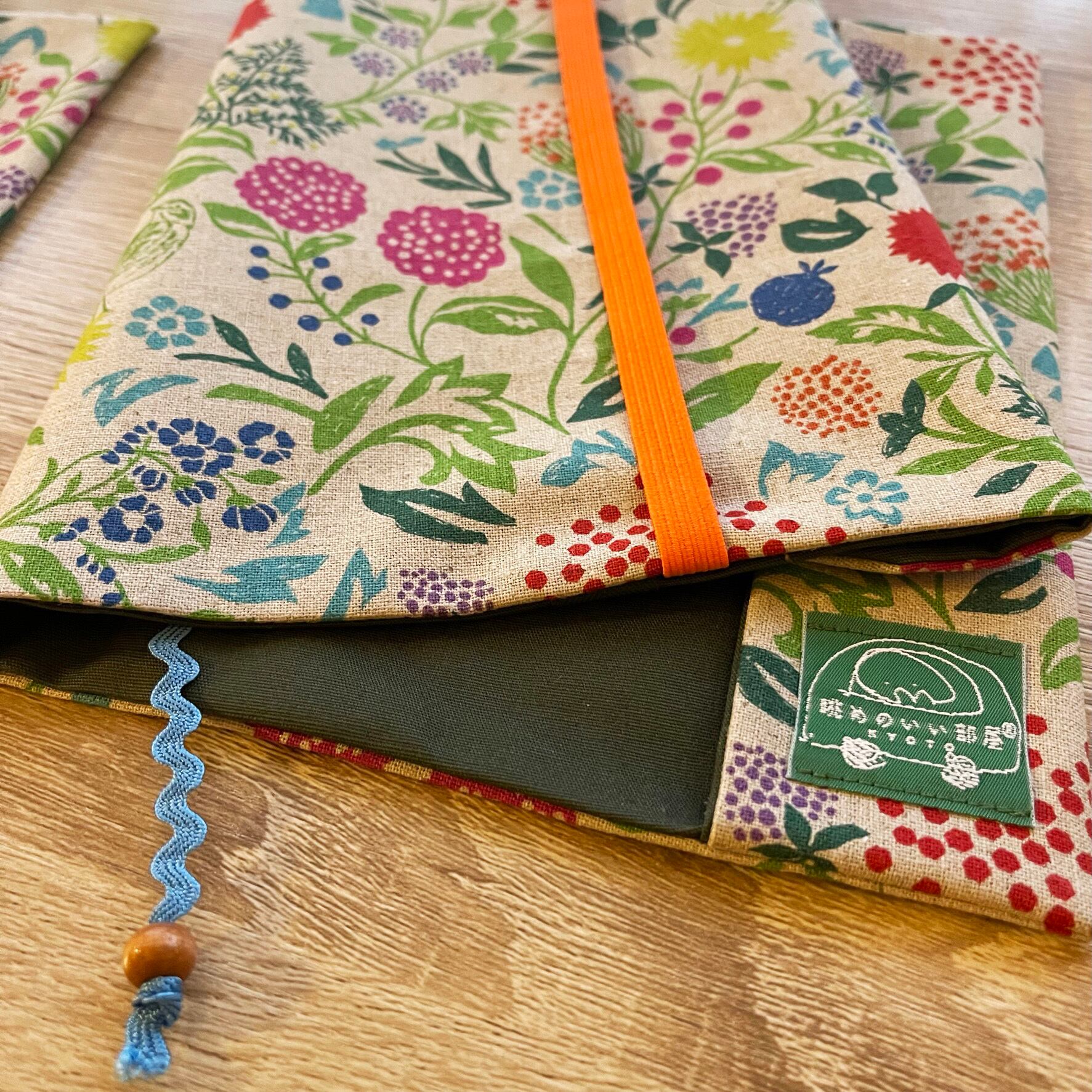 表地はコットンリネンのキャンバス地でキナリにカラフルなプリントです。