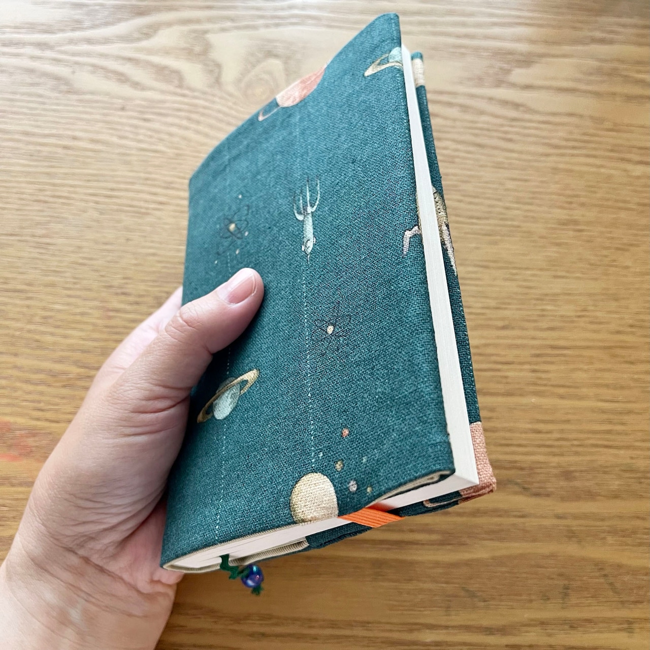 表地はノスタルジックな宇宙のイラストがかわいい、しっかりめのコットン生地です。