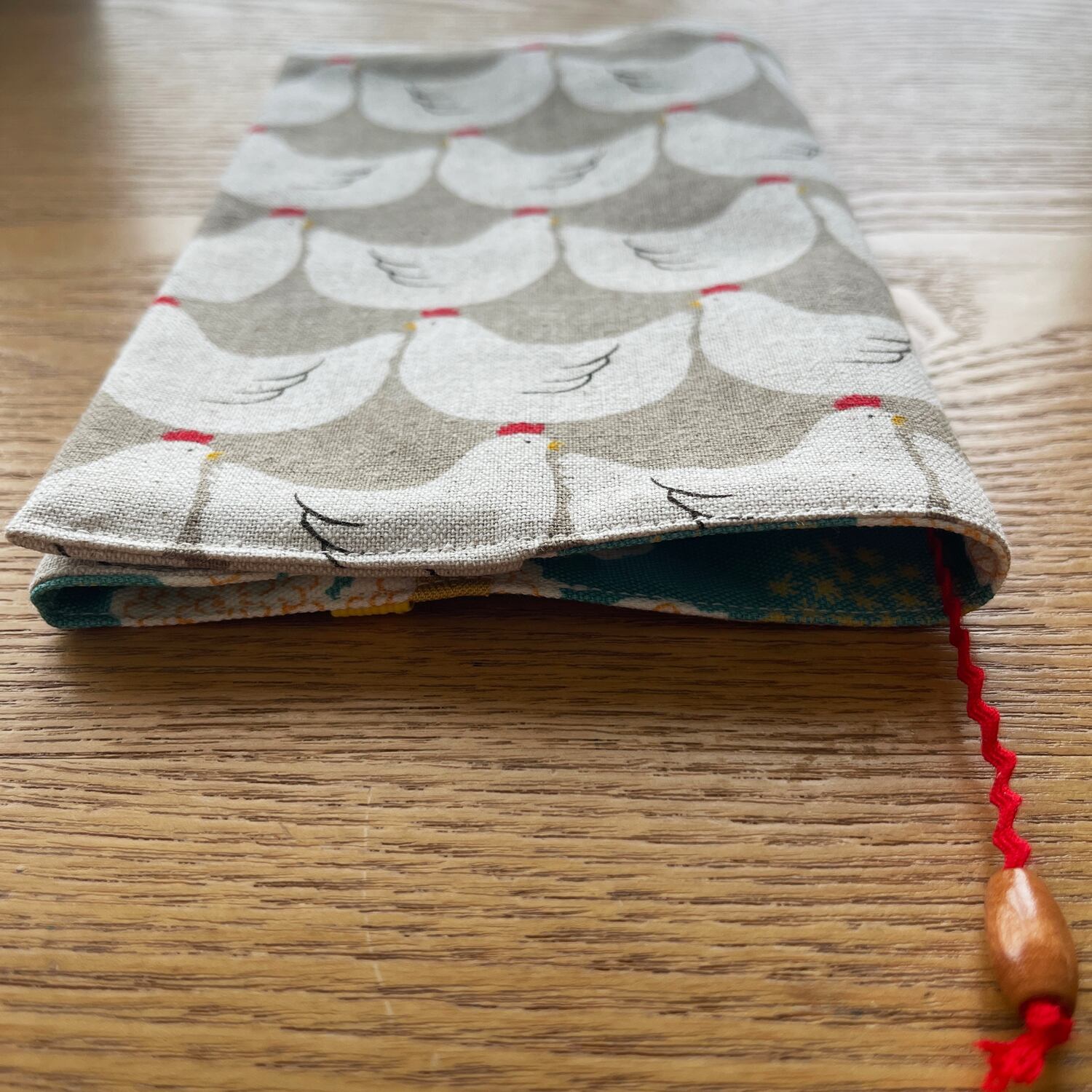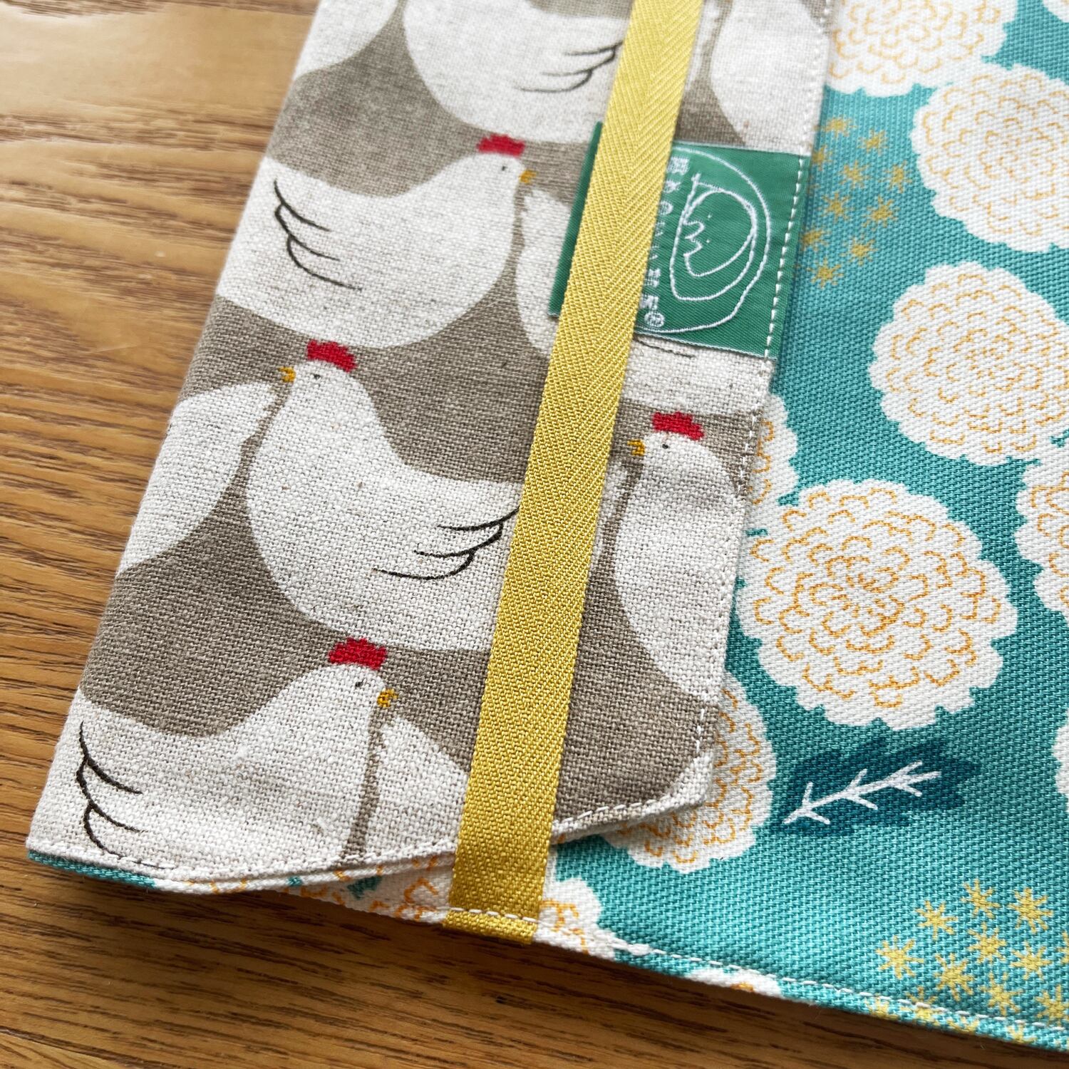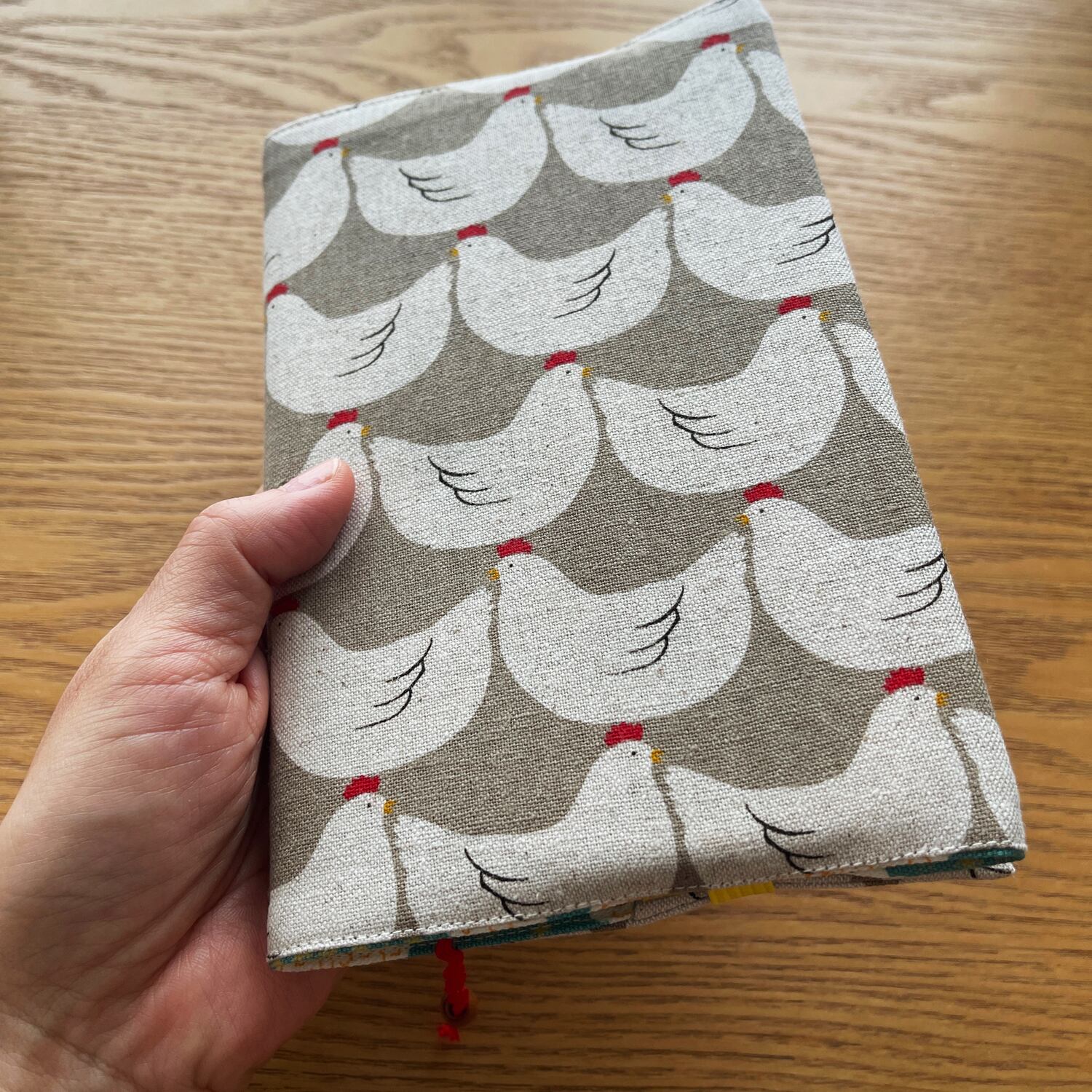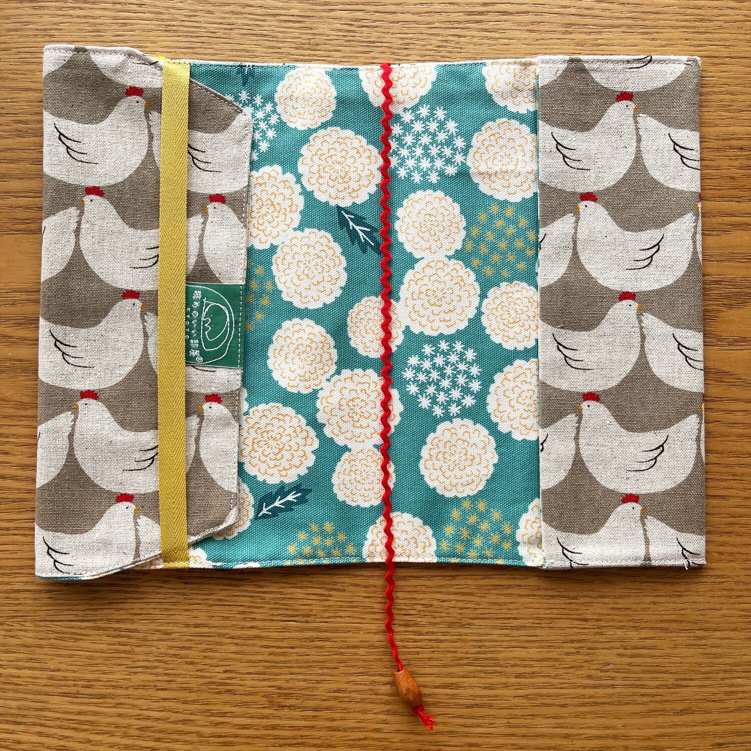 表地はにわとりのイラストがほっこりかわいいコットンリネンです。