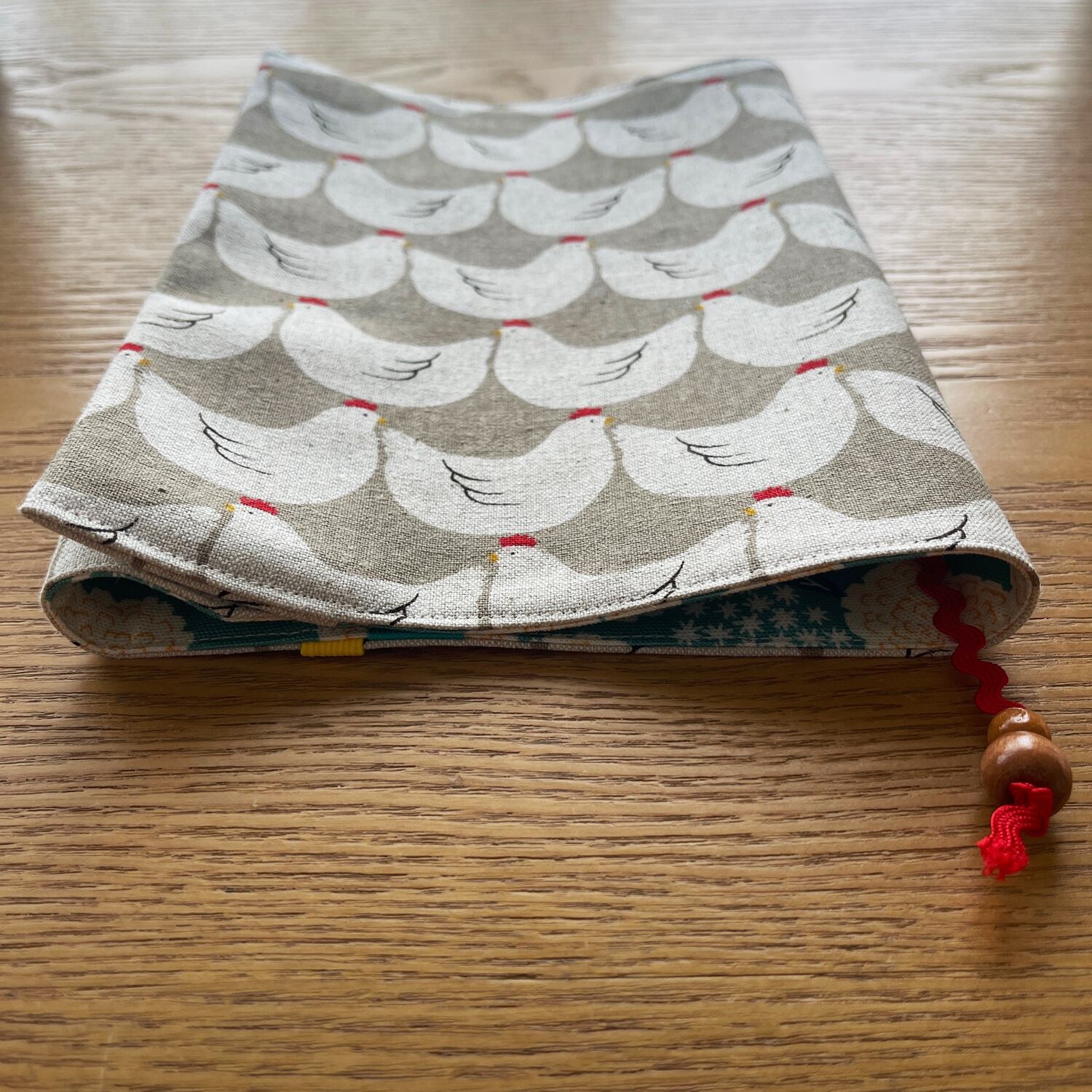 表地はにわとりのイラストがほっこりかわいいコットンリネンです。