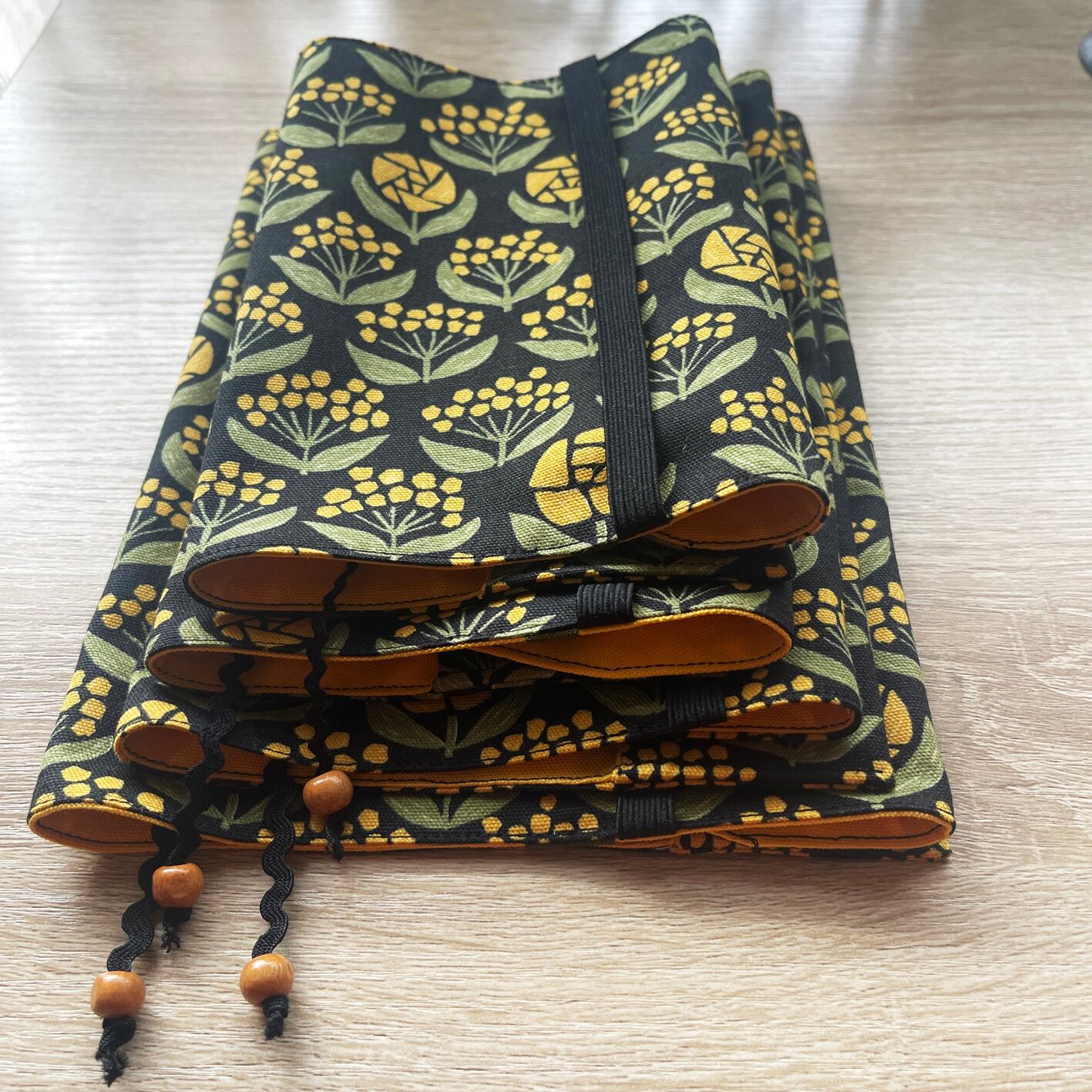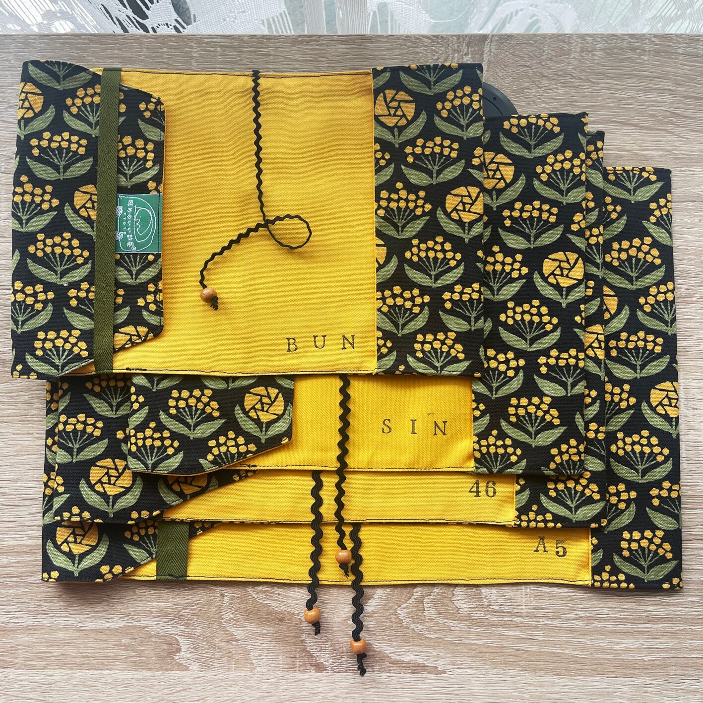 表地はブラック地に黄色いミモザとバラがかわいいオックス生地です。