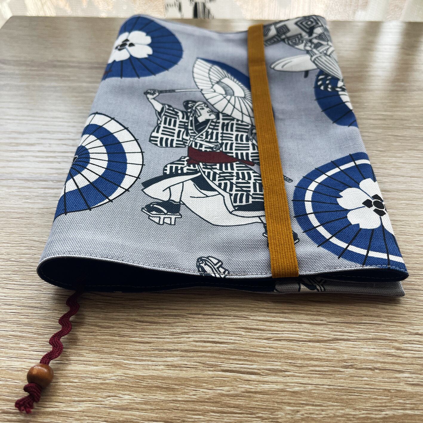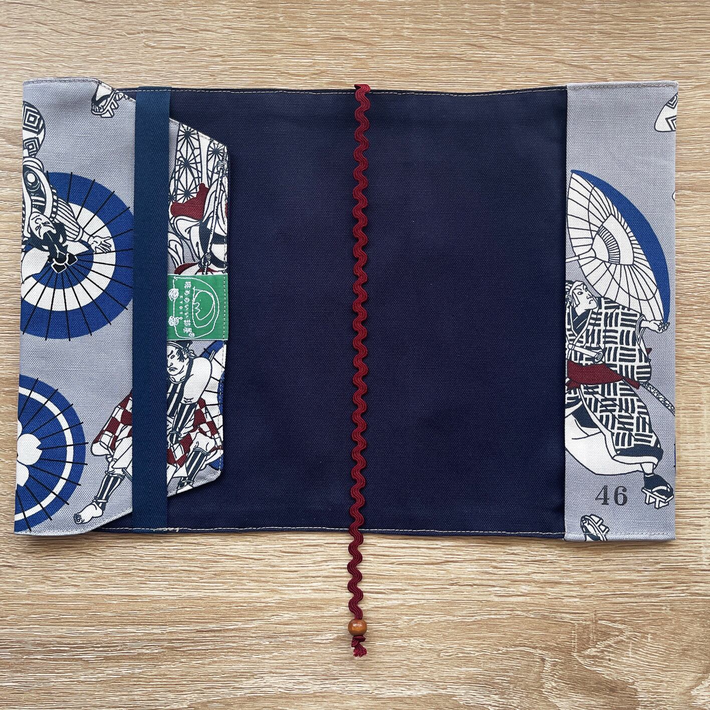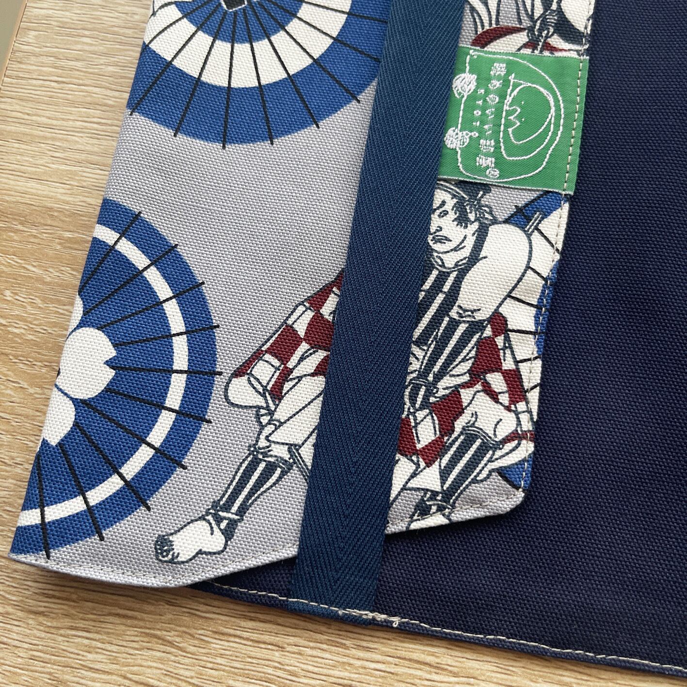 表地はブルーグレーに歌舞伎のイラストが素敵なオックスフォード生地です。