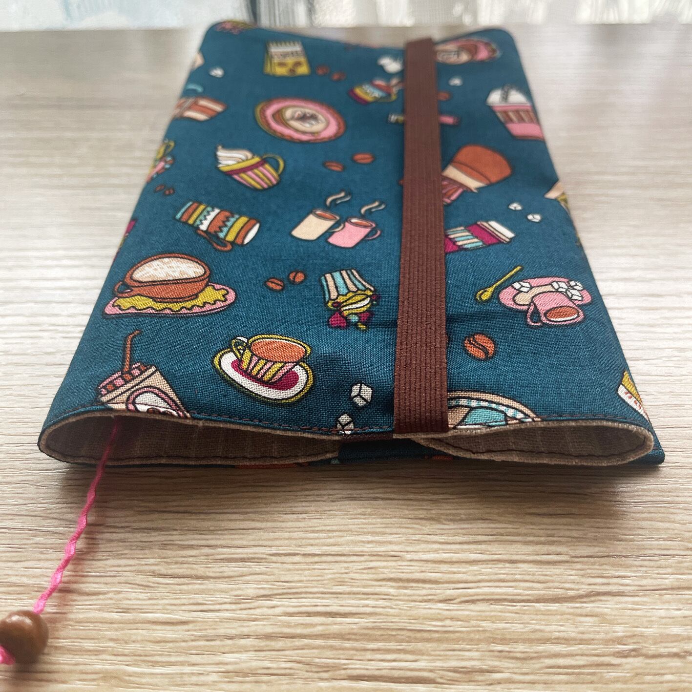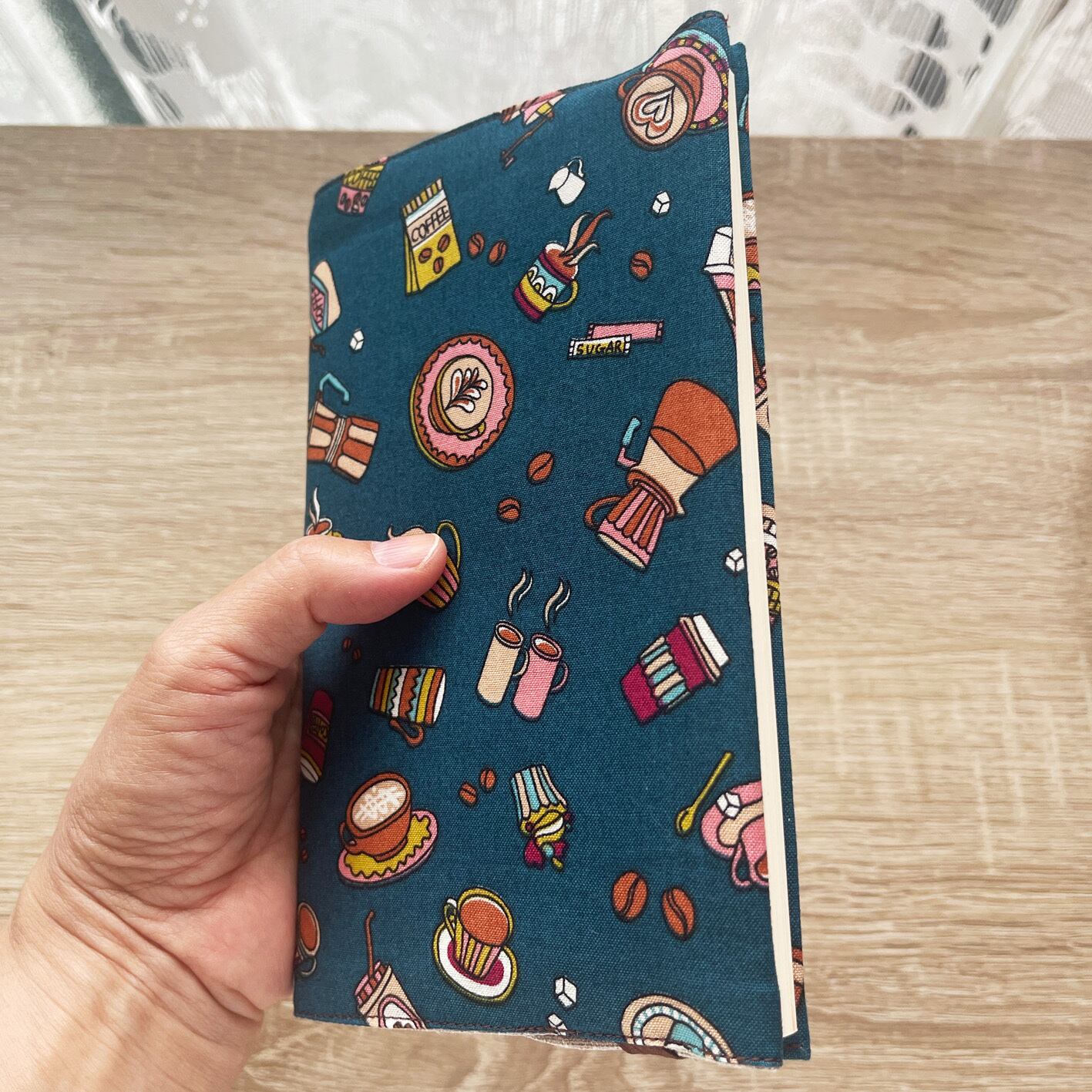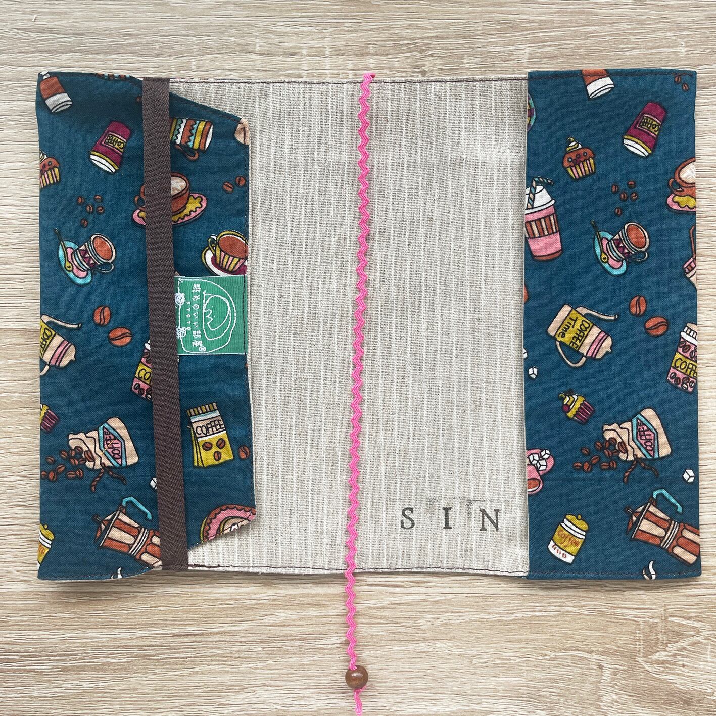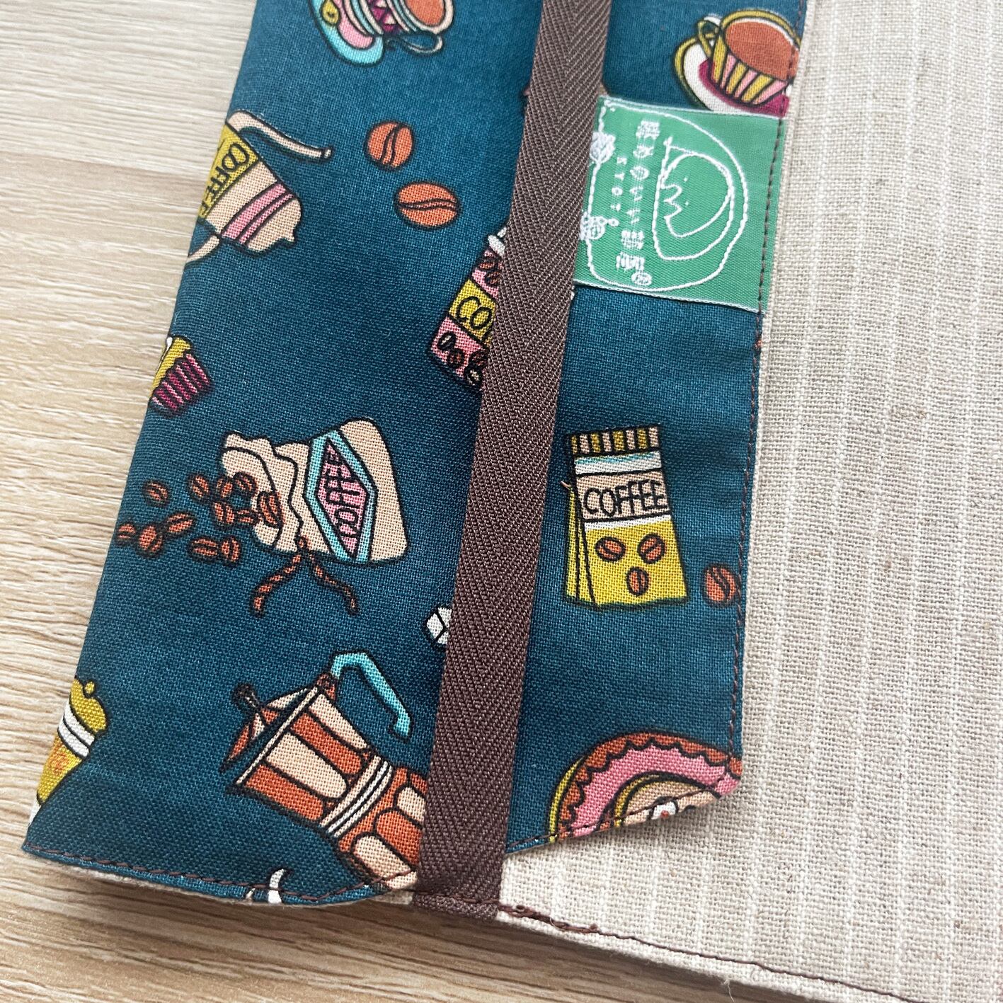表地は深いグリーンブルー地に珈琲にまつわるイラストが可愛い生地です。