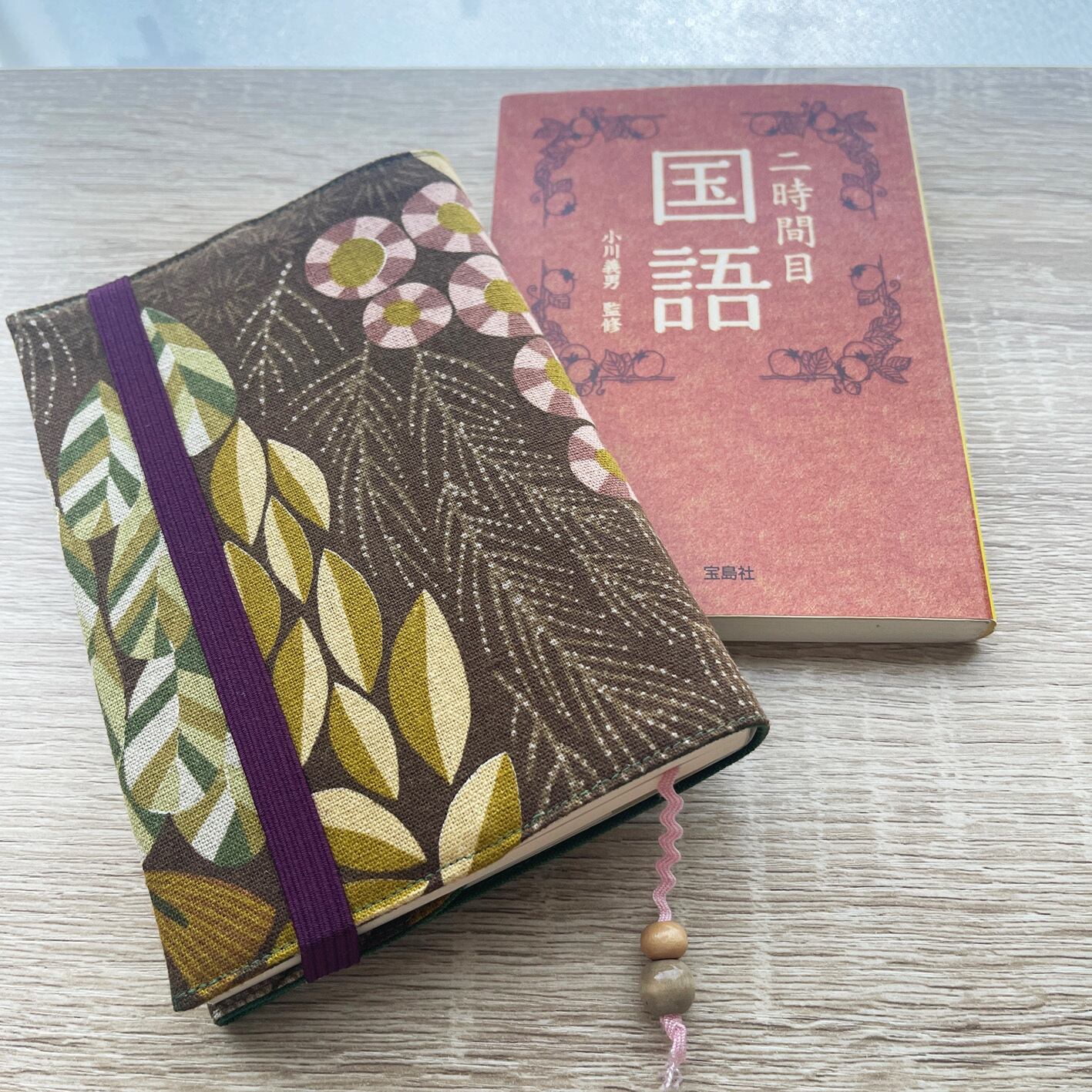 パープルのゴムバンドと淡いピンクの栞を合わせました。