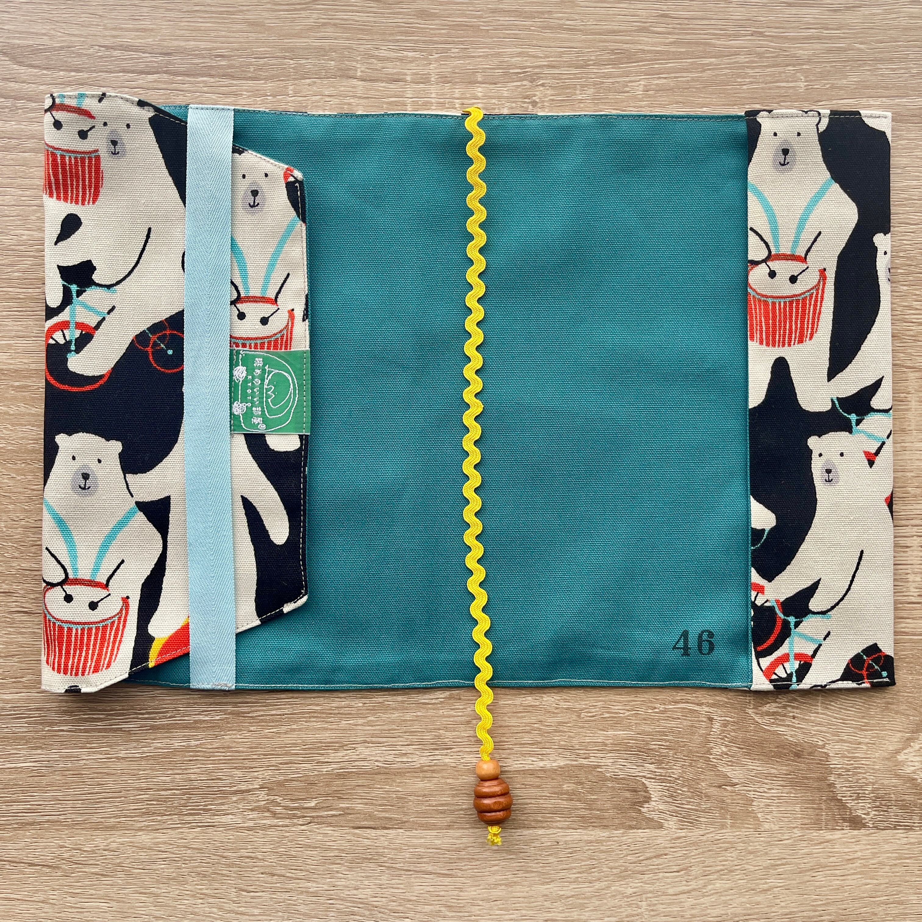 ピーコックブルーの裏地、黄色い栞を合わせました。