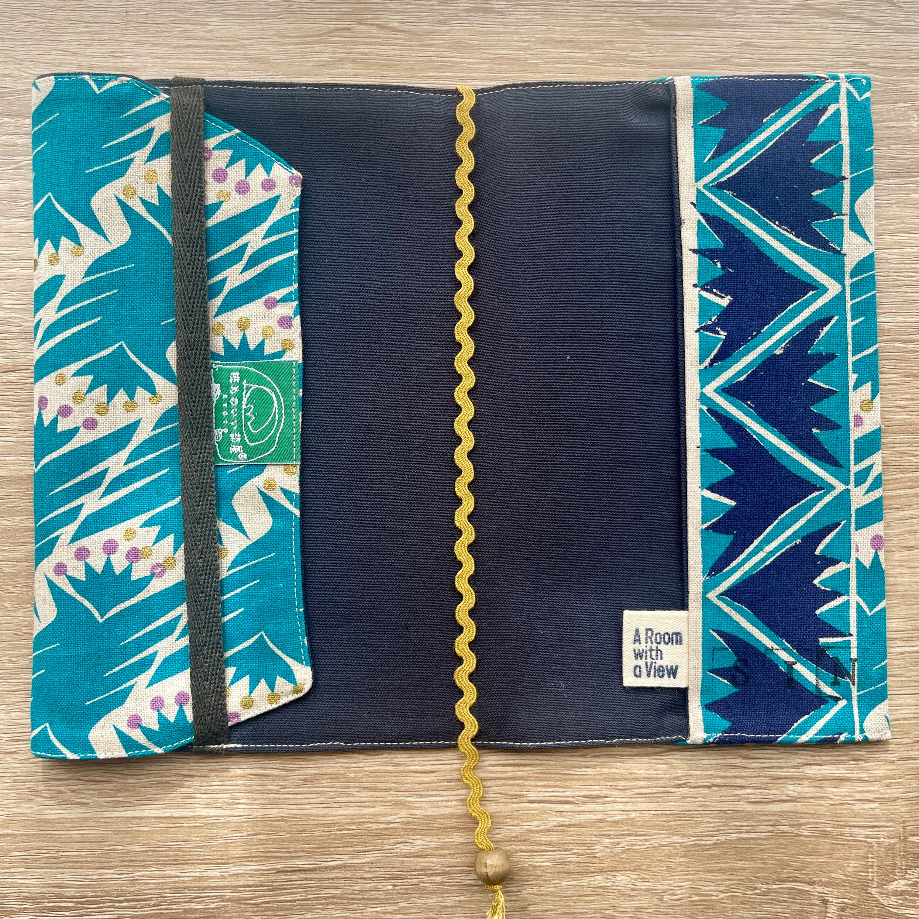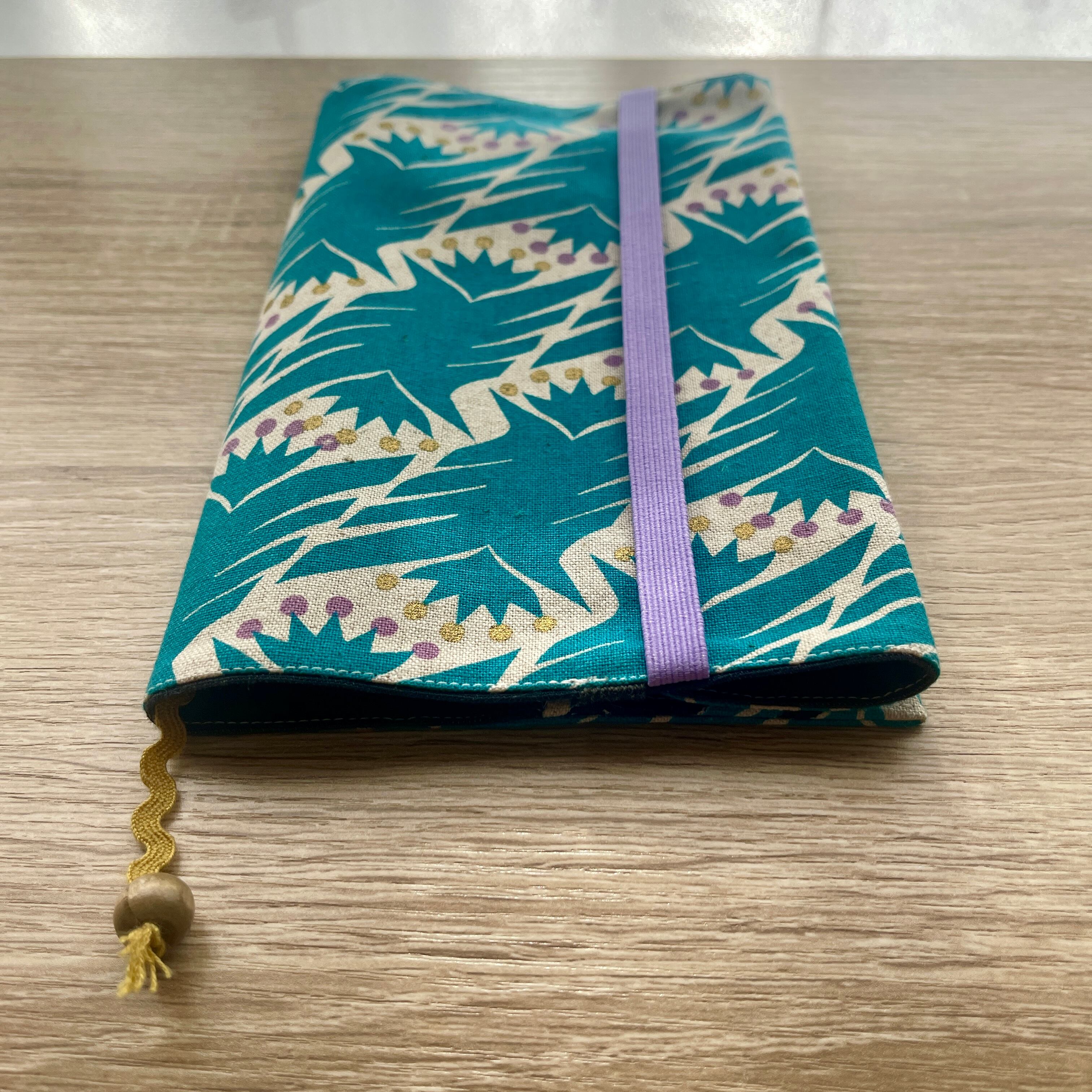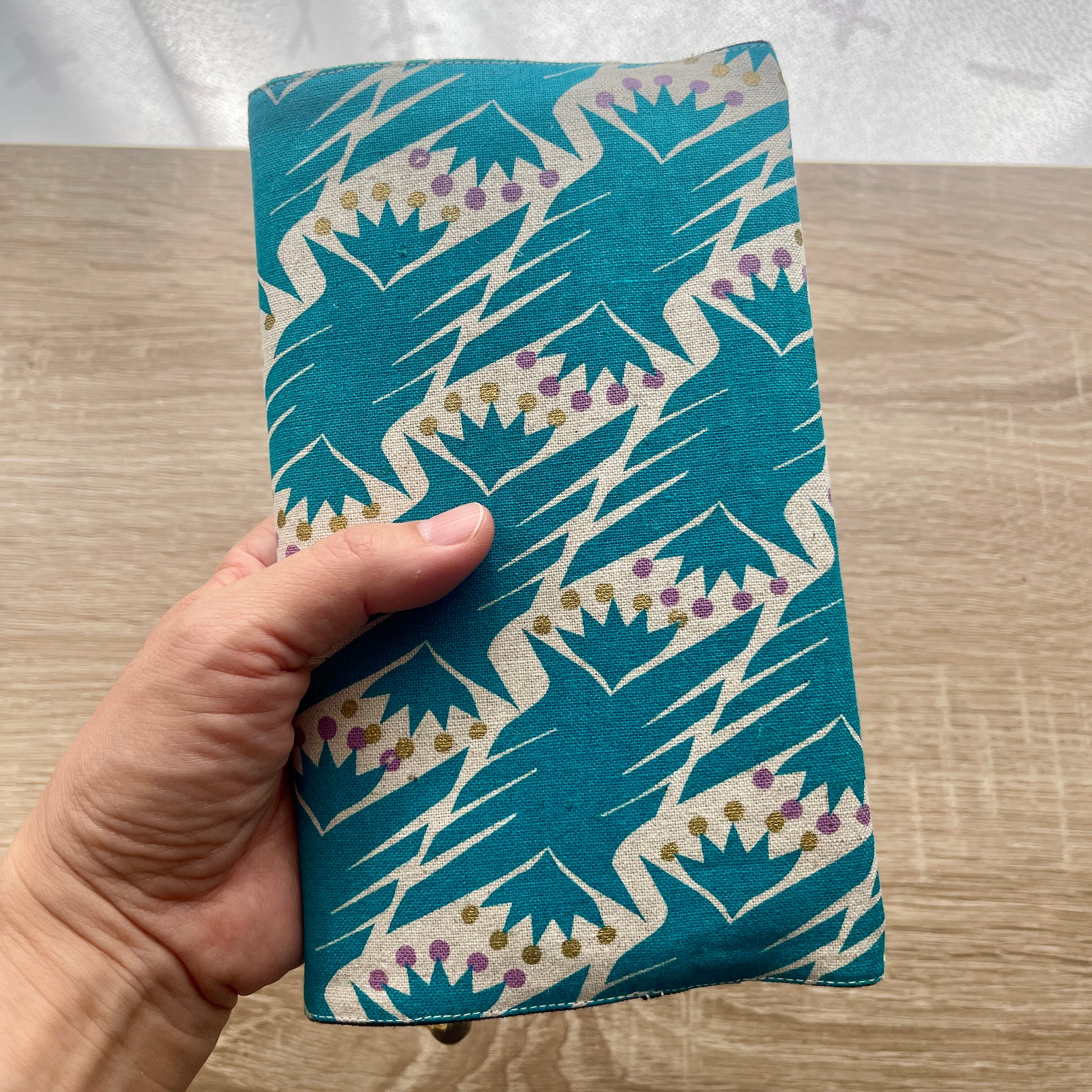 表地はコットンリネンでピーコックブルーの模様がカッコイイです。