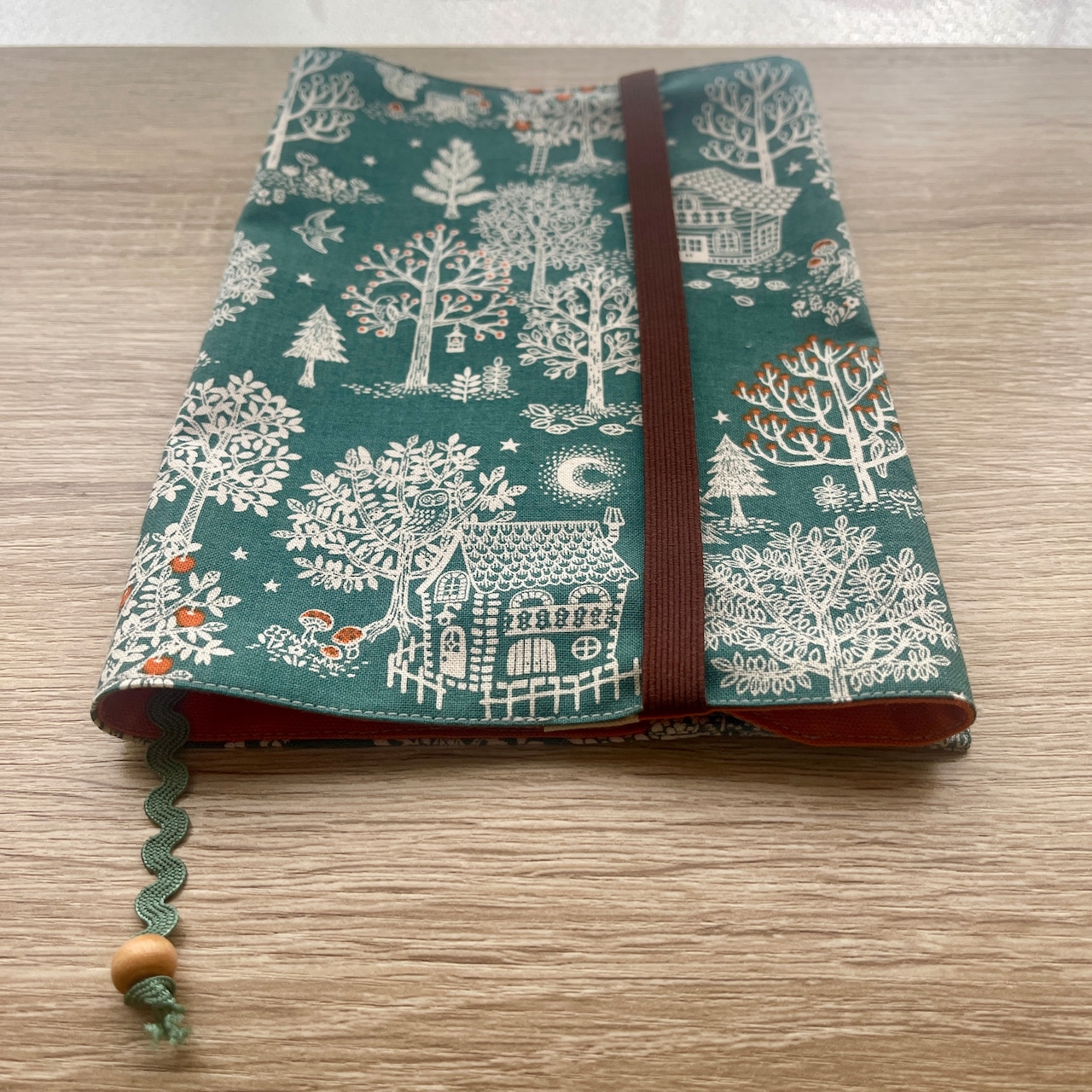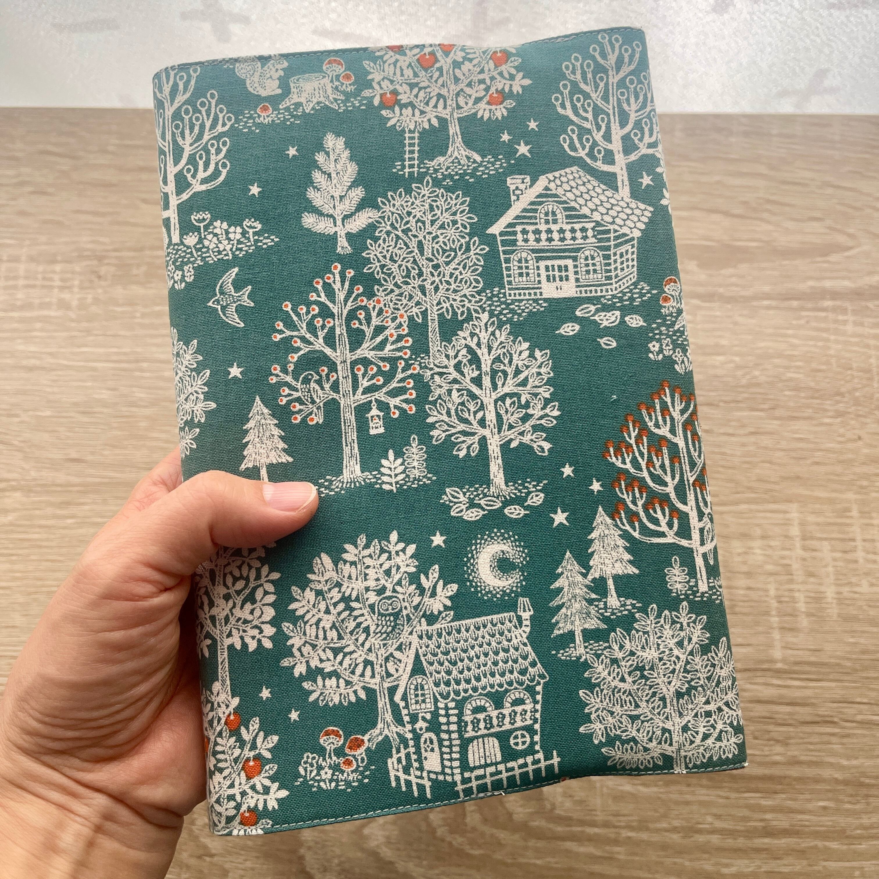 ピーコックグリーン色の森の様子が可愛いコットン生地に